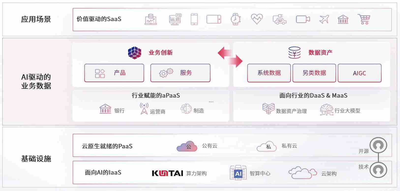 数字时代,,围绕企业数字化转型的关键要素,,开元ky888数码开创性的提出数云融合战略和技术体系框架,,着力在云原生、、、、数字原生、、、AI原生和信创产业上架构产品和服务能力,,,,为处在不同数字化转型阶段的快消零售、、、汽车、、、金融、、、、医疗、、政企、、、、教育、、、、运营商等行业客户提供泛在的敏捷IT能力和融合的数据驱动能力,,,构建跨界融合创新的数字业务场景和新业务模式,,助力企业级客户建立面向未来的核心能力和竞争优势,,,,全面推动社会的数字化、、、、智能化转型升级。。。